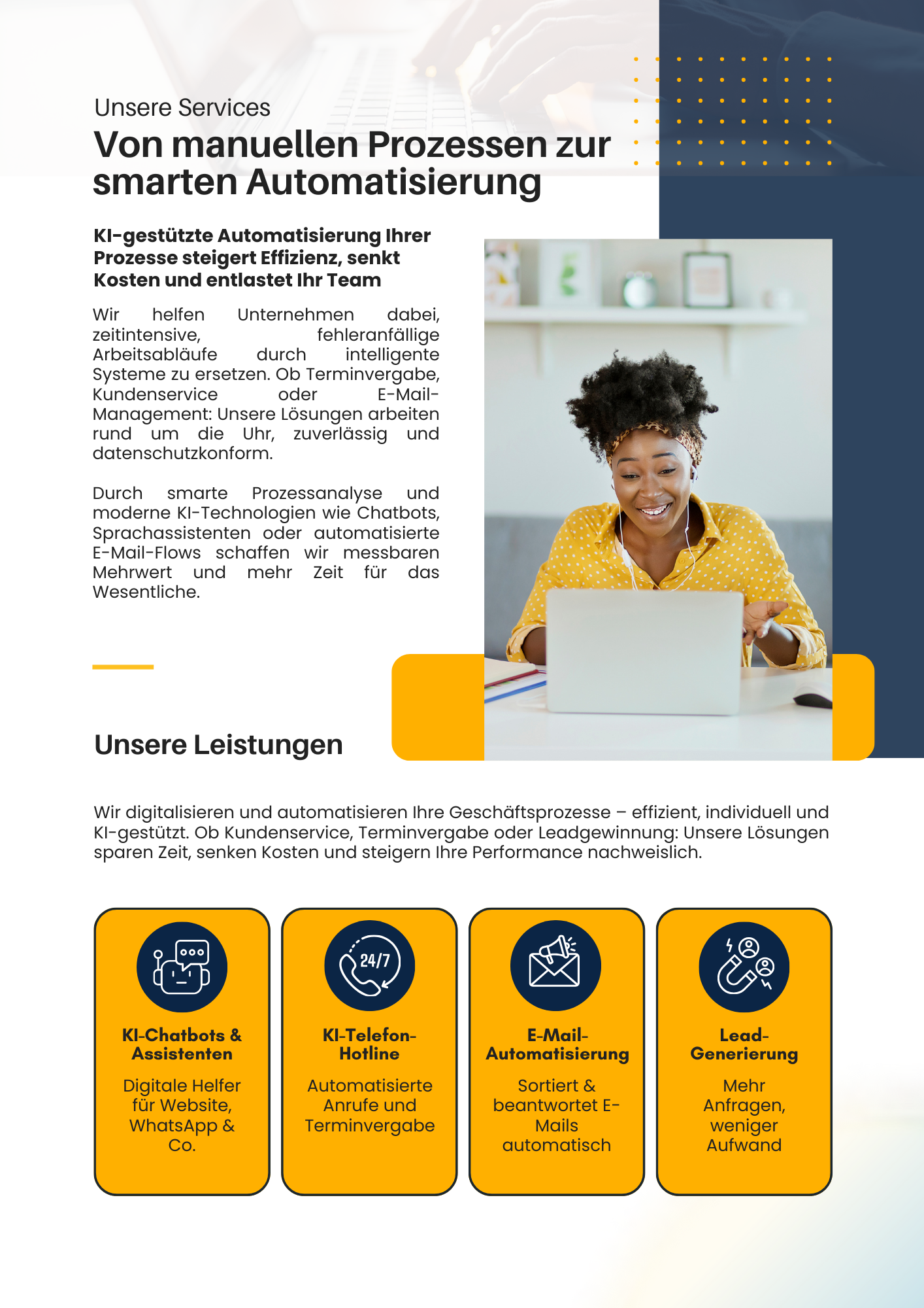 Als spezialisierter Anbieter für KI-gestützte Automatisierungslösungen begleiten wir Unternehmen dabei, ihre internen Abläufe zu optimieren und Kundenerlebnisse nachhaltig zu verbessern.